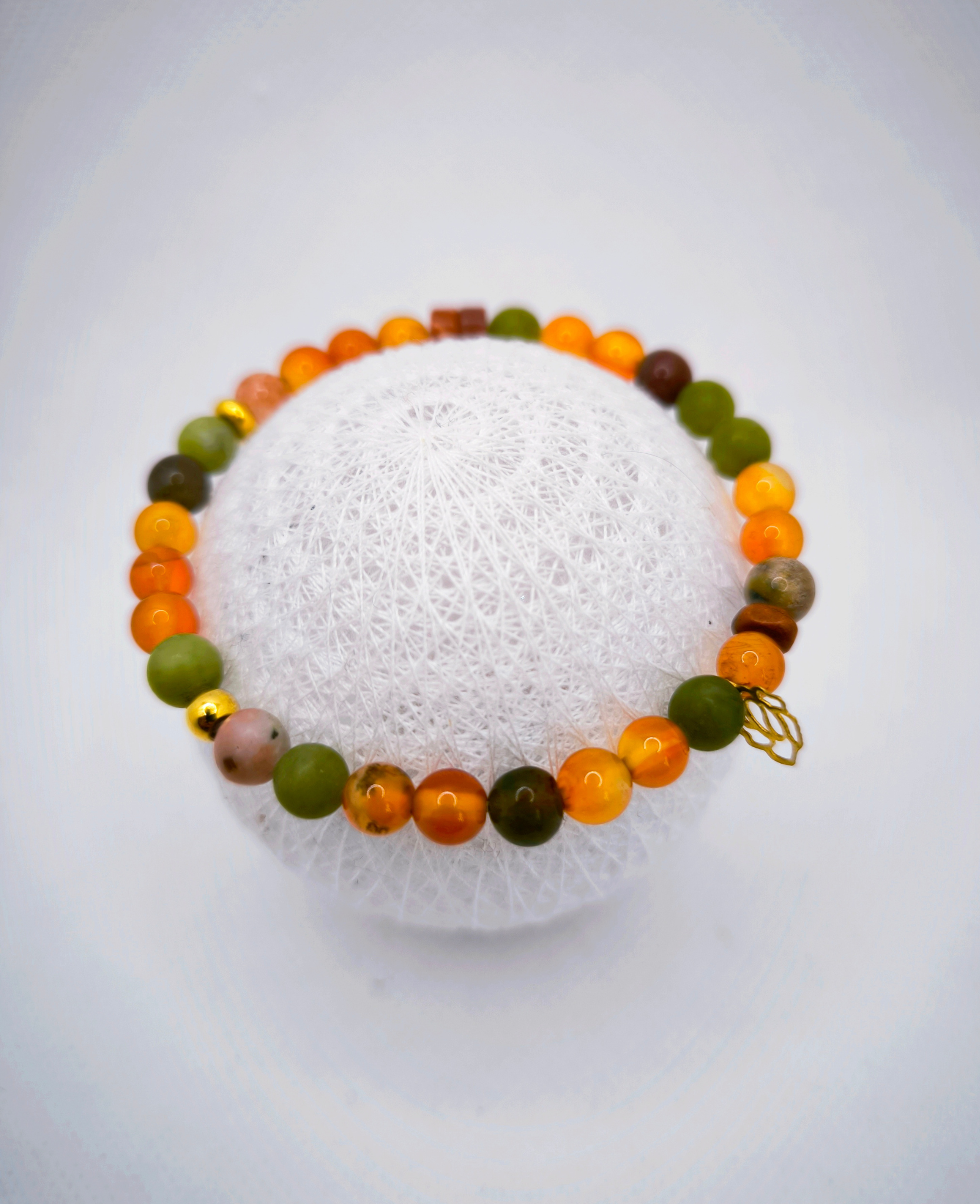 Laissez-vous séduire par la beauté naturelle et l’énergie positive de ce bracelet en pierres naturelles Serpentine, d’Agate et Granit