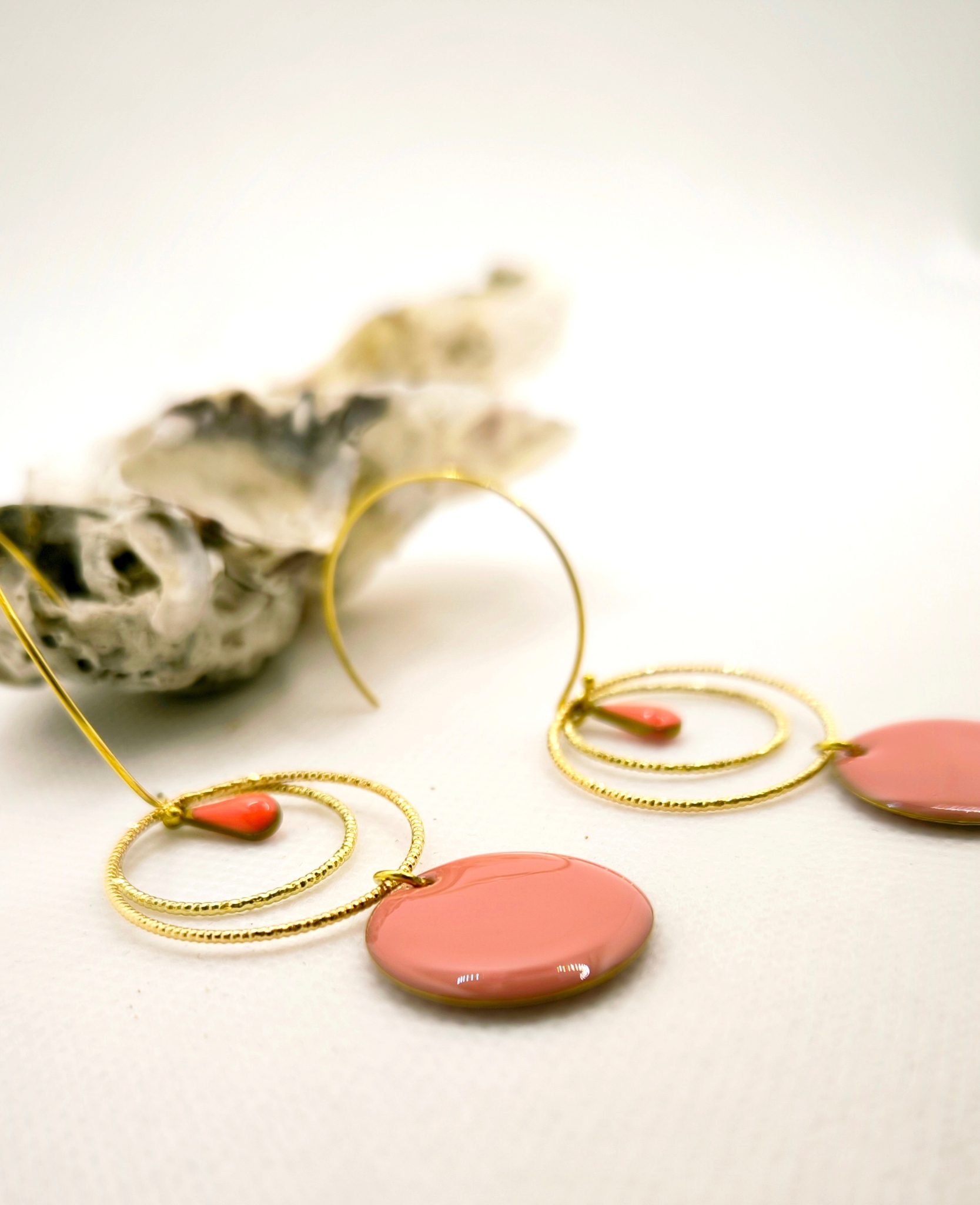 Conçues en acier inoxydable doré, elles sont idéales pour les peaux sensibles et résistantes à l’usure. Chaque boucle est ornée d’un délicat sequin rose poudré, ajoutant une subtile touche de romantisme