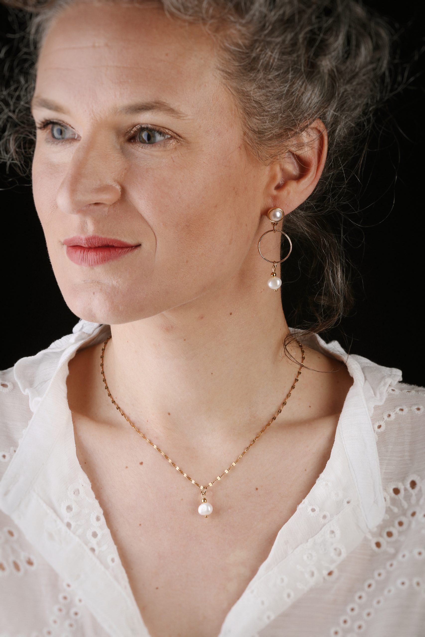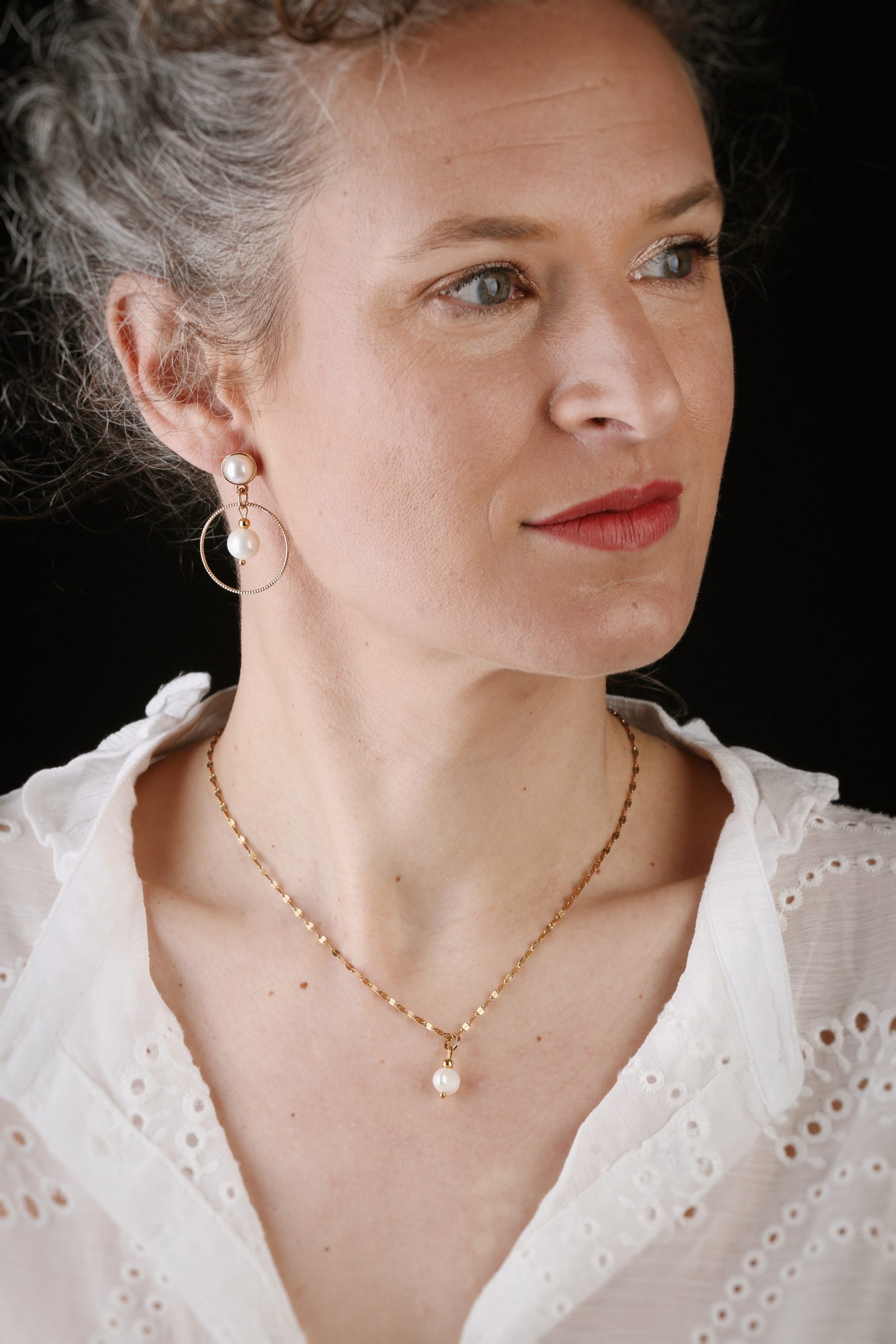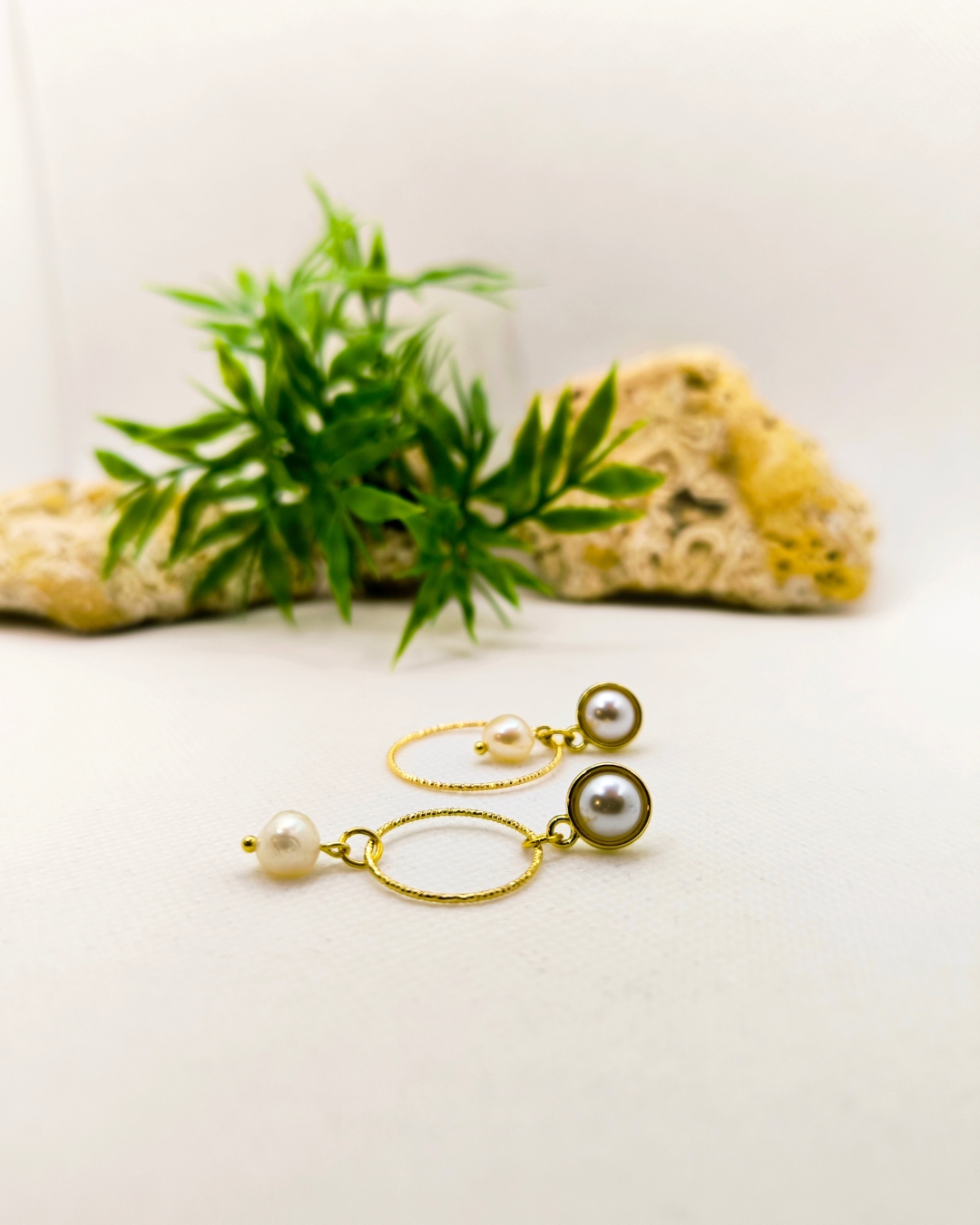 Paire de boucles d’oreilles faite d’acier inoxydable, de perle de synthèse et de perles d’eau douce