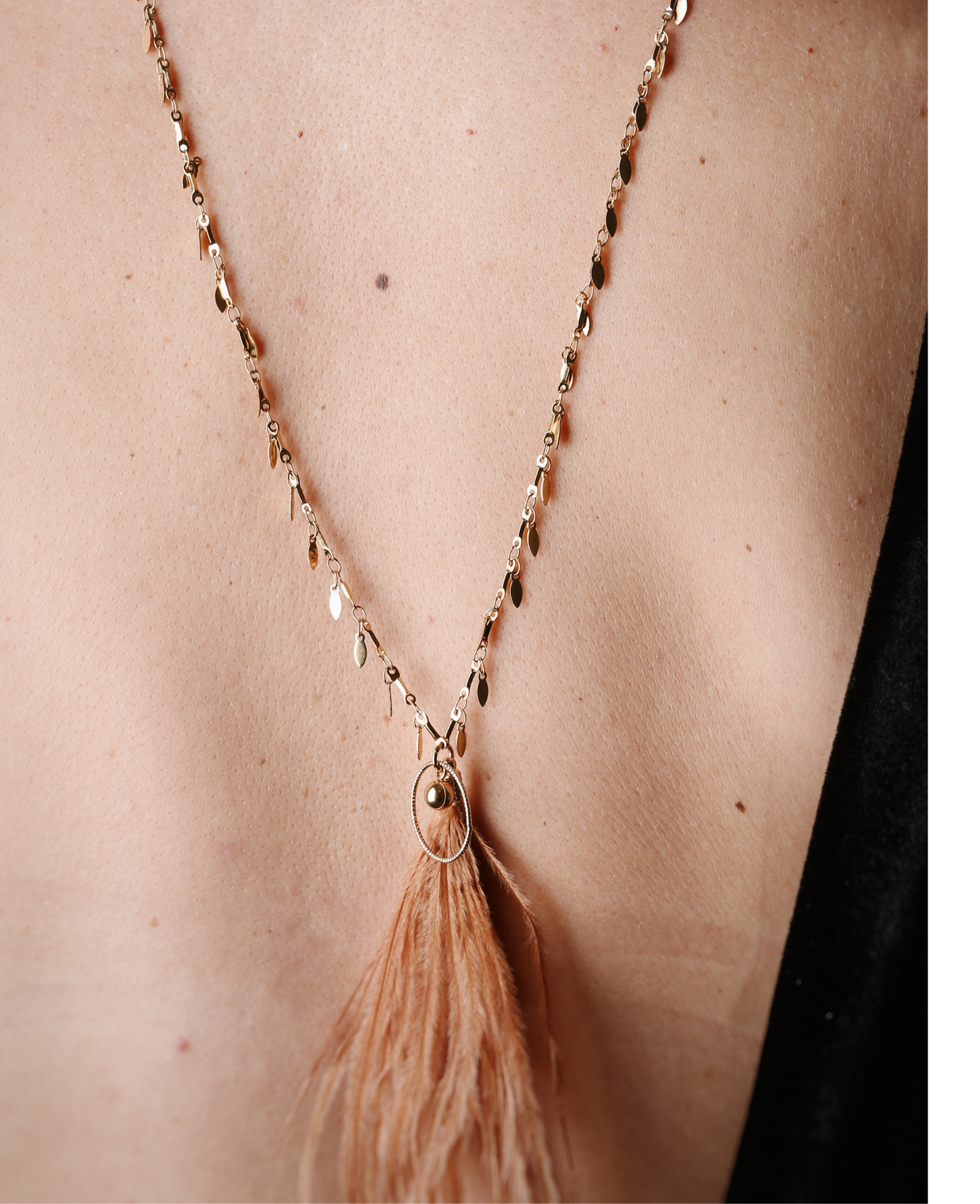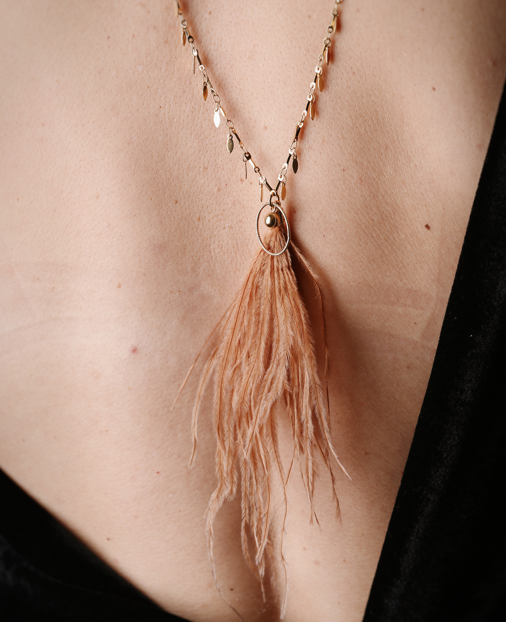 Il est composé d’éléments couleurs or, de pampilles, et d’une plume d’autruche chocolat